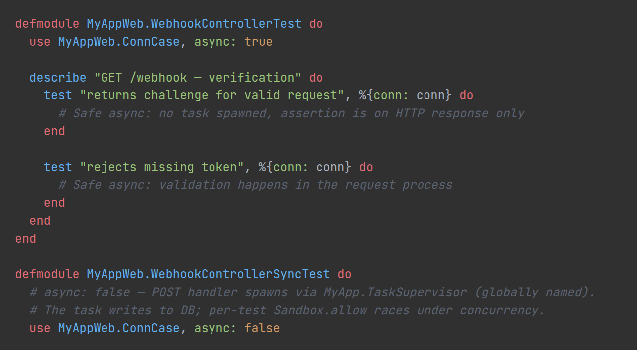 Phoenix context test files grow fast. A single accounts_test.exs can easily reach 300+ lines, and without structure it becomes hard to find tests, spo...