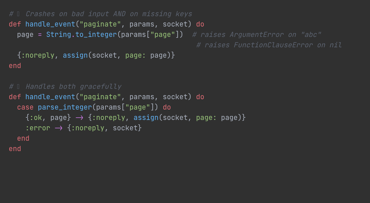 Phoenix does zero automatic type coercion. Every value in params arrives as a string — or not at all. Reaching for String.to_integer/1 on user-supplie...