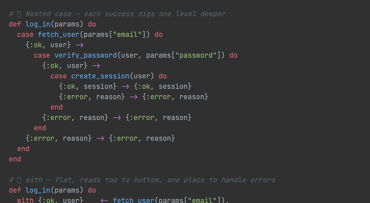 Nested case statements for operations that can fail look neat at first — until you need three of them. with lets you sequence failable operations and ...