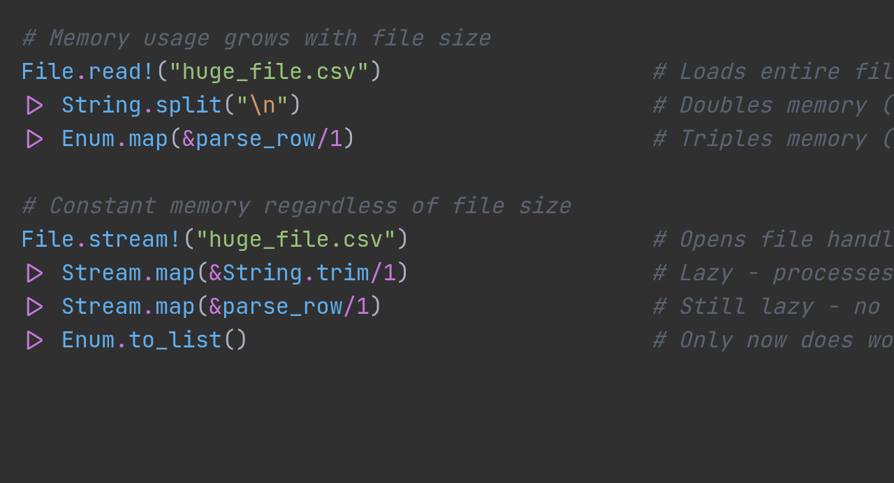 File.read!/1 loads the entire file into memory. A 2GB log file? That's 2GB of RAM. Use File.stream!/1 to process files line-by-line with constant memo...