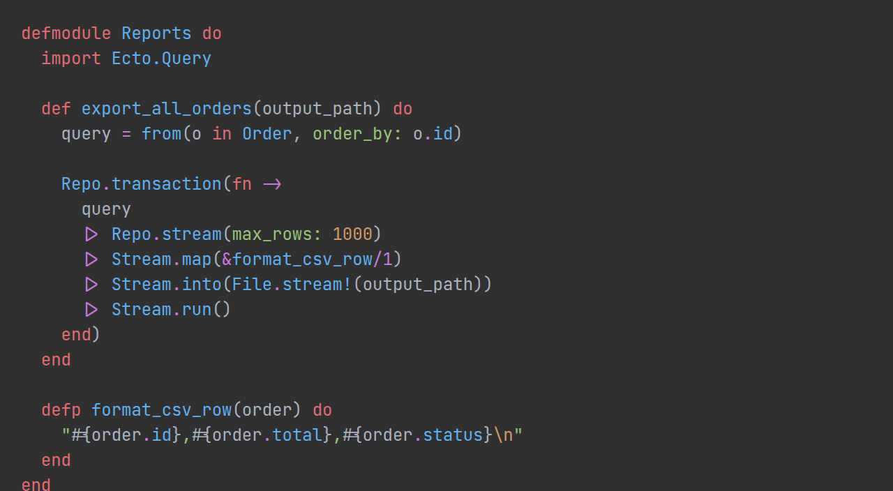 Exporting a million database rows? Repo.all/2 loads everything into memory first. Repo.stream/2 uses database cursors to fetch rows in batches, keepin...