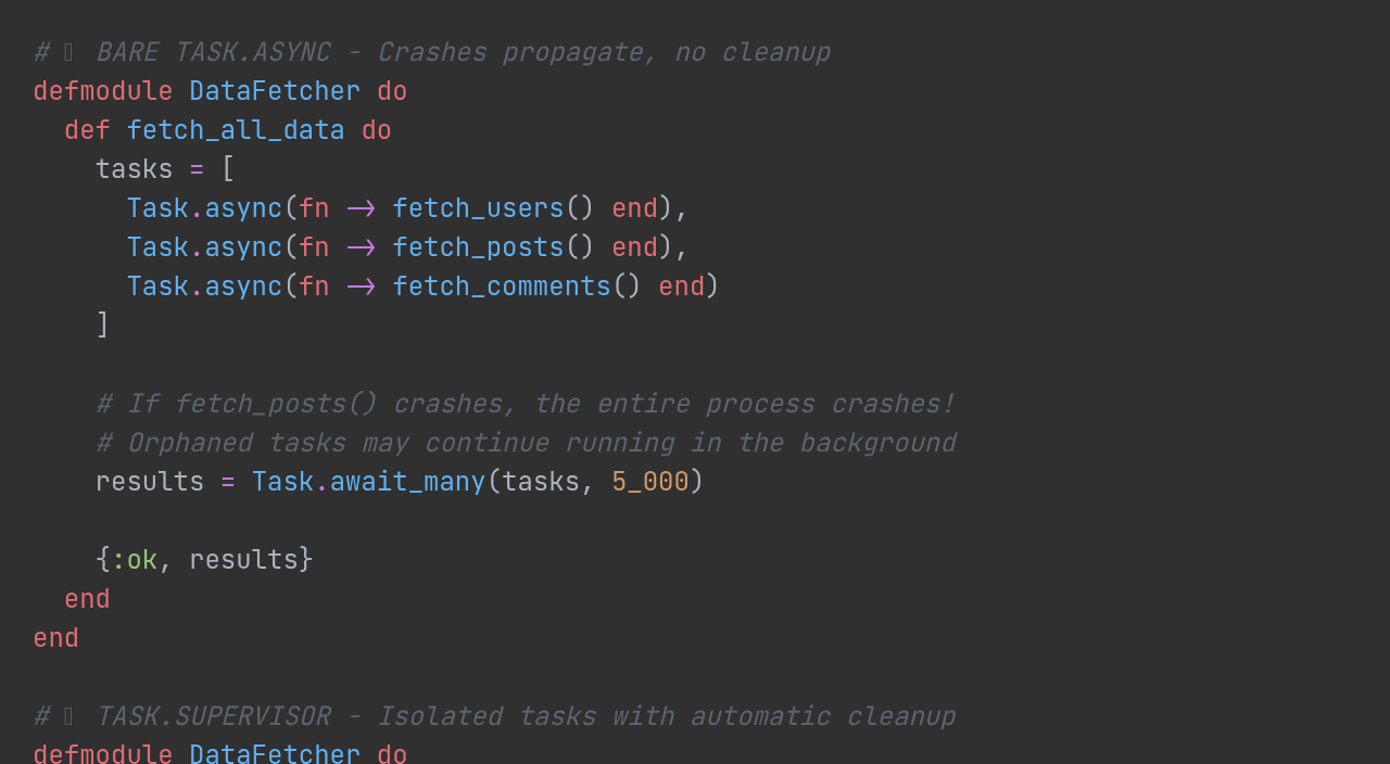 Bare Task.async creates linked tasks that can crash your process or leave zombie tasks running. Task.Supervisor provides supervised tasks with automat...